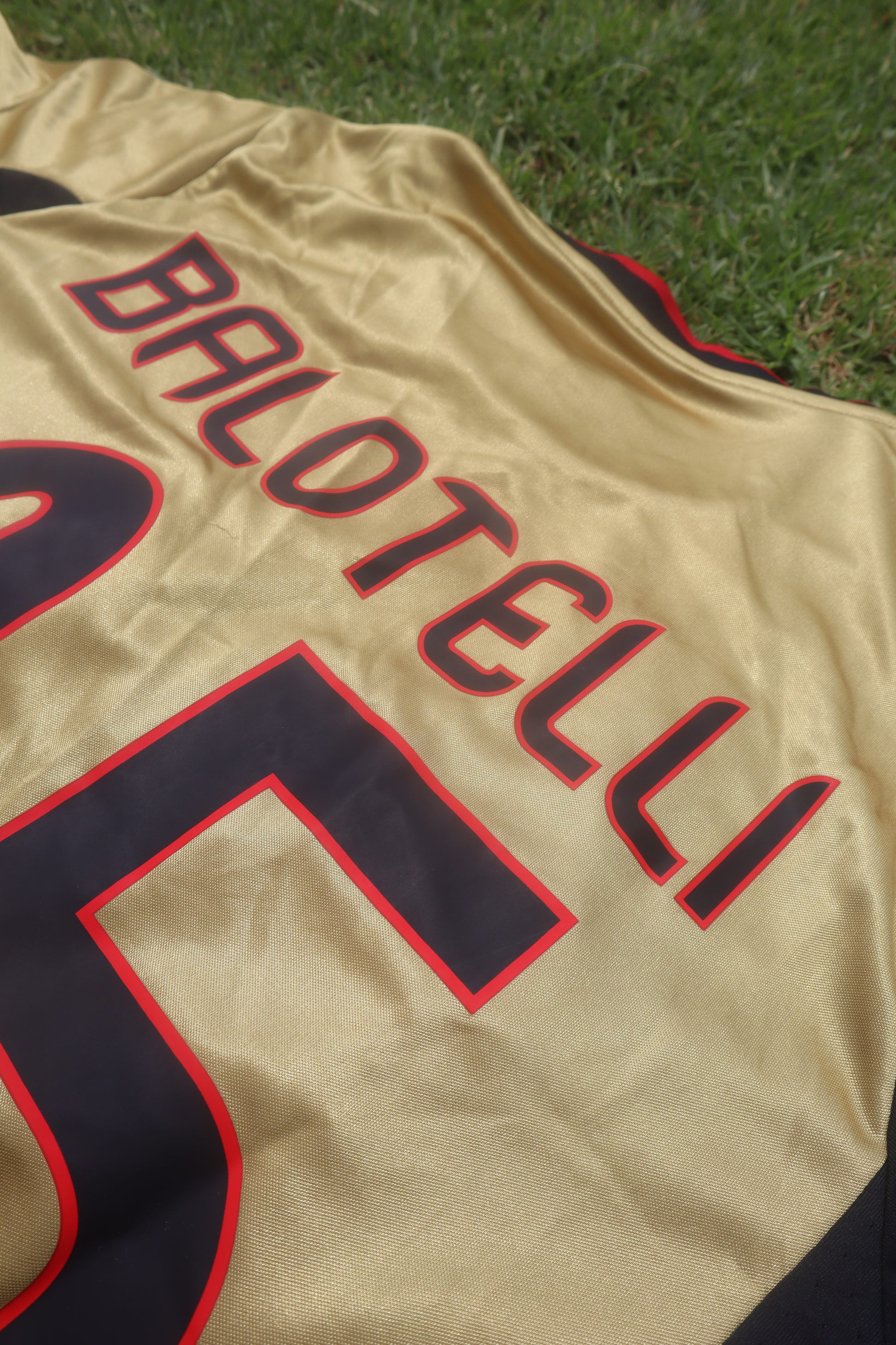 Finished in striking gold with black and red detailing, this jersey features the Champions League starball patch on the sleeve, the UEFA “Respect” badge, adidas Climacool construction, Fly Emirates sponsor, and the iconic single Scudetto star above the crest—making it a distinctive European matchday piece from Balotelli’s second Milan spell.