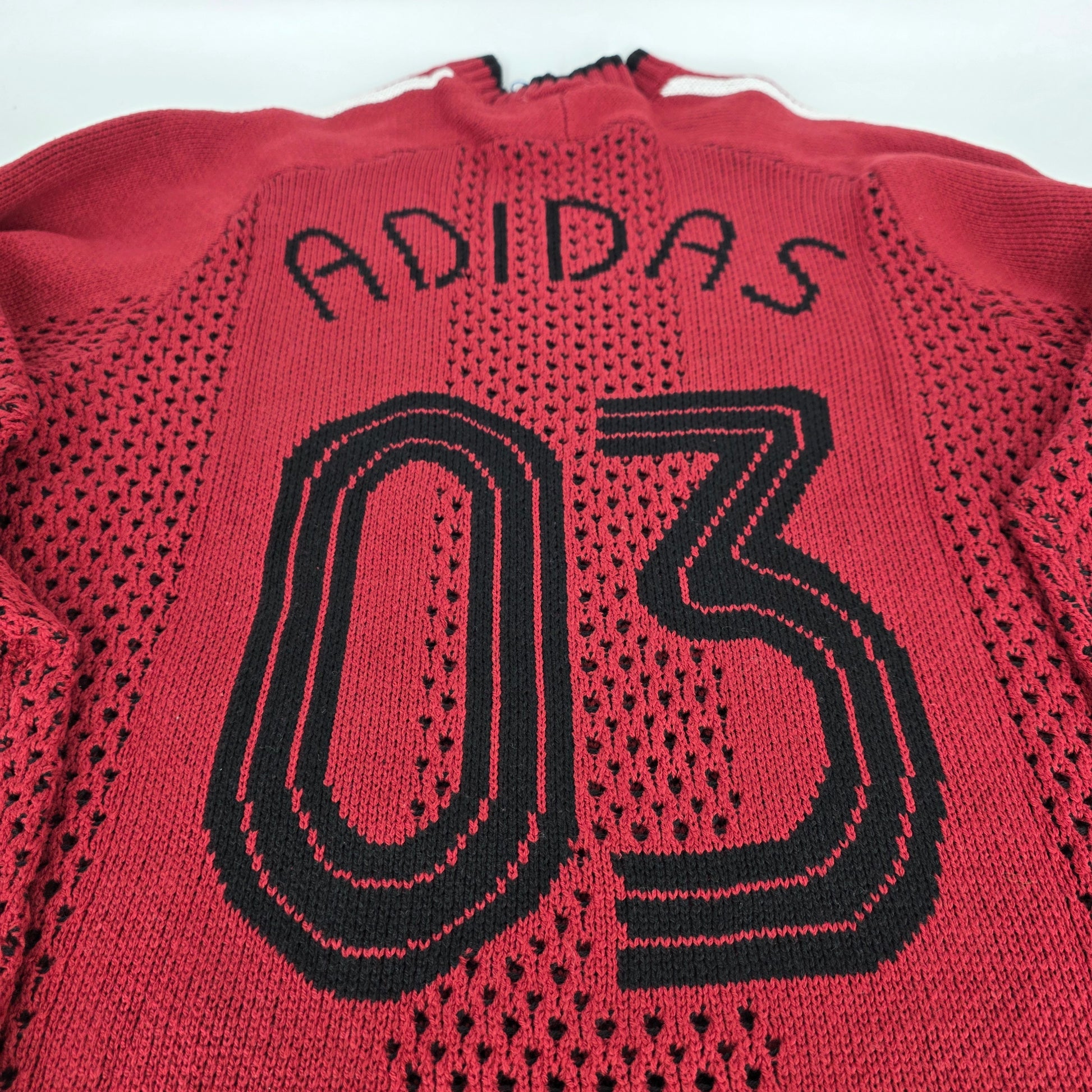 Features: Perforated knit fabric, Trefoil embroidery, oversized Adidas chest logo, ribbed trims, 3-Stripes shoulder detailing