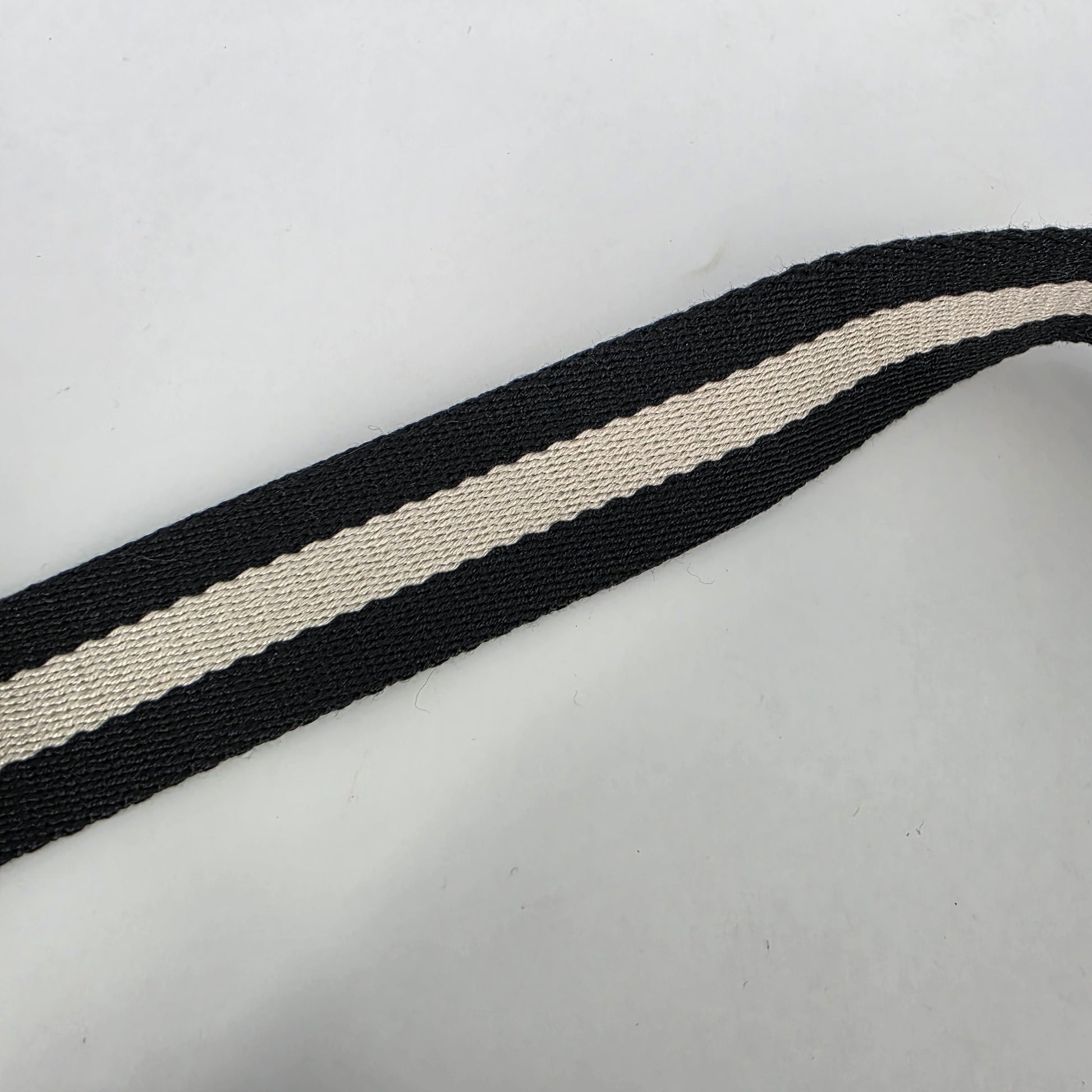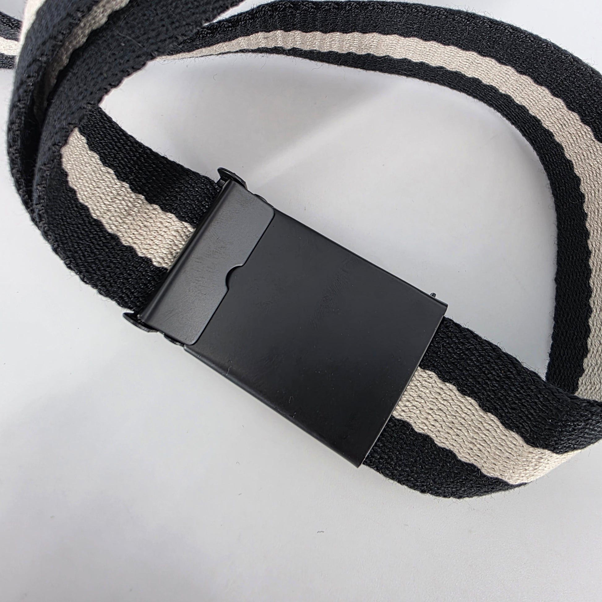 Features: Woven cotton blend strap, metal buckle with logo engraving, stripe design, adjustable fit