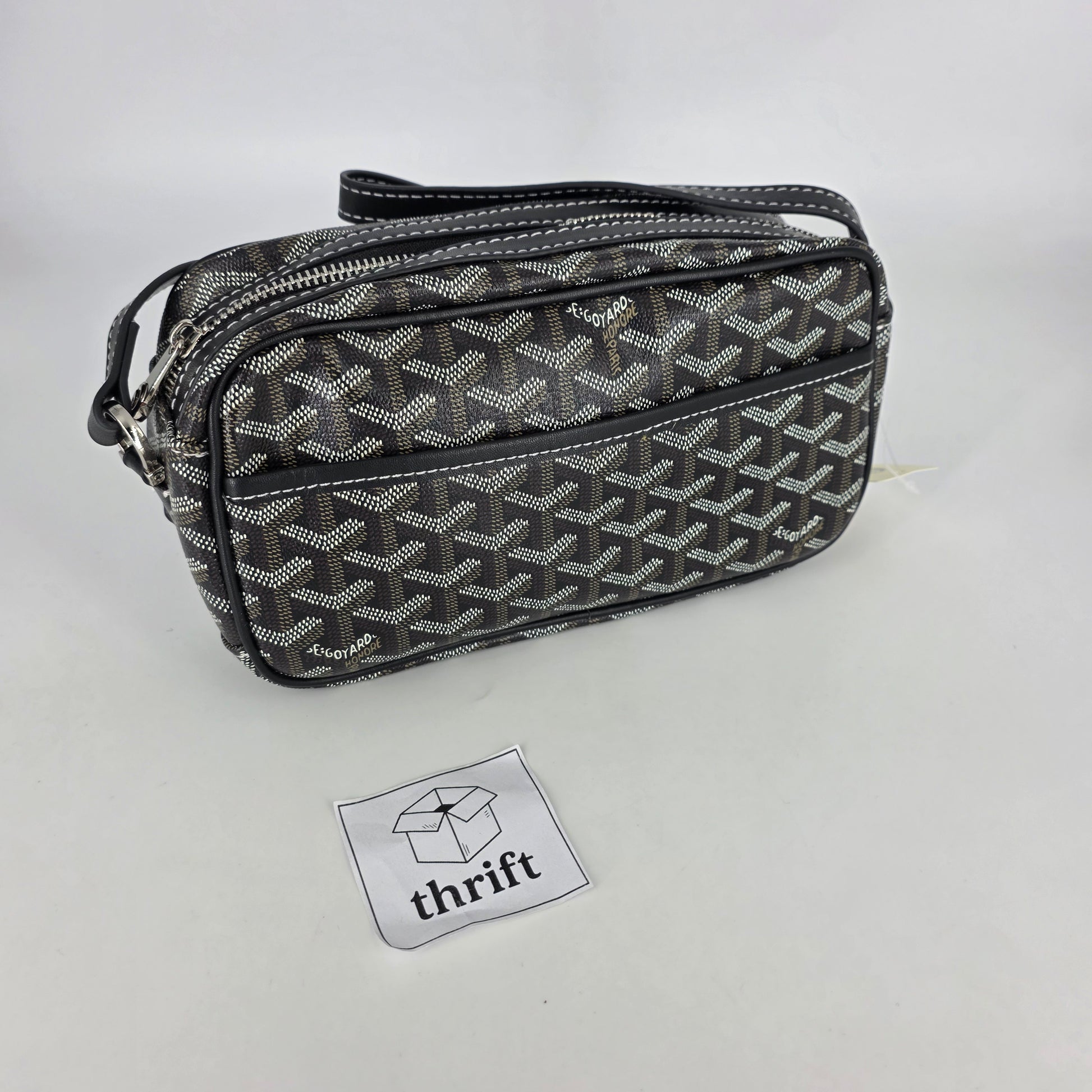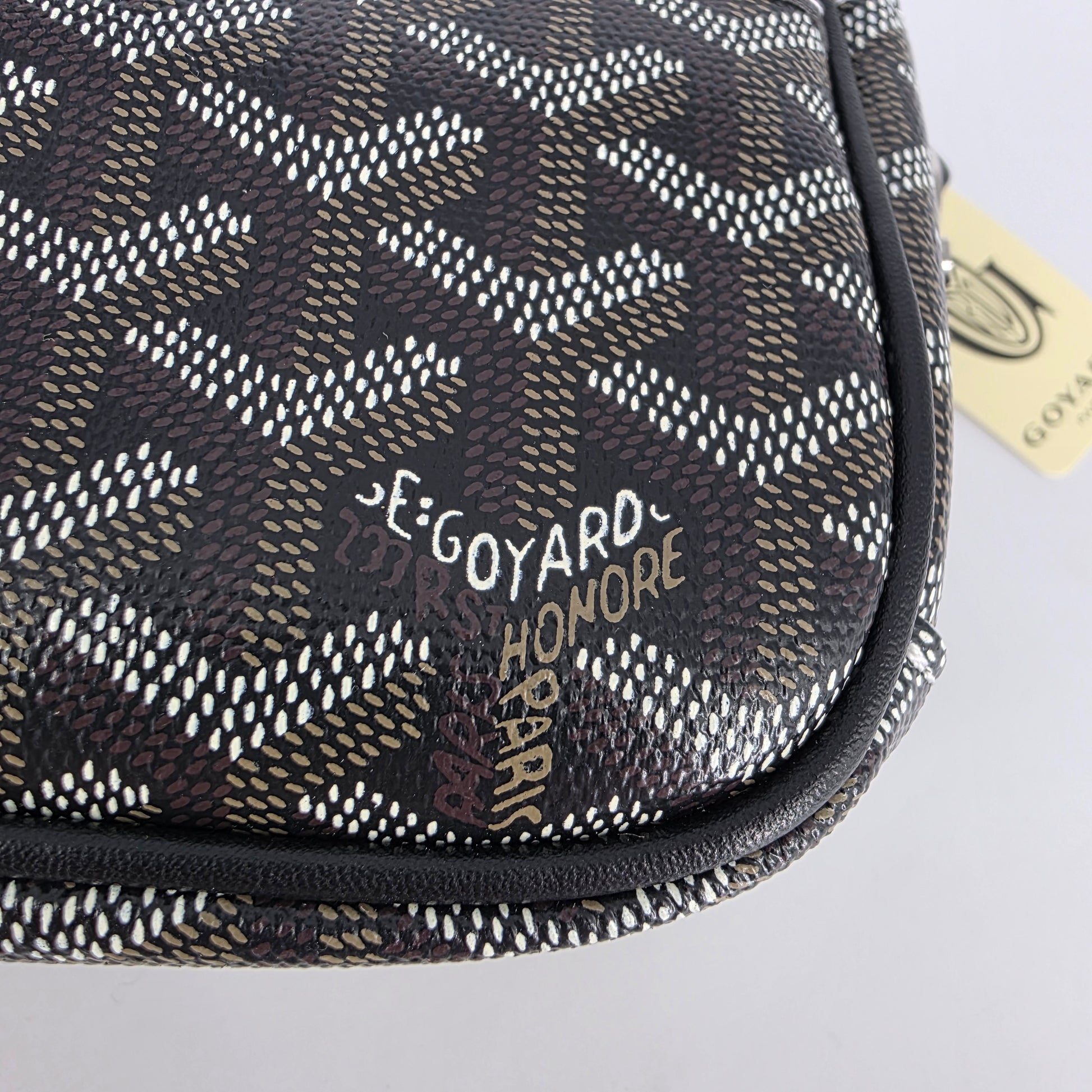 Elevate your essentials with the Goyard Cap Vert Crossbody Bag in a sleek black colorway. This compact silhouette features the iconic hand-painted Goyardine canvas, accented with tonal leather trim and meticulous contrast stitching. Designed for both form and function, it includes a front zipped compartment and a main zip-around section to keep your daily carry organized.