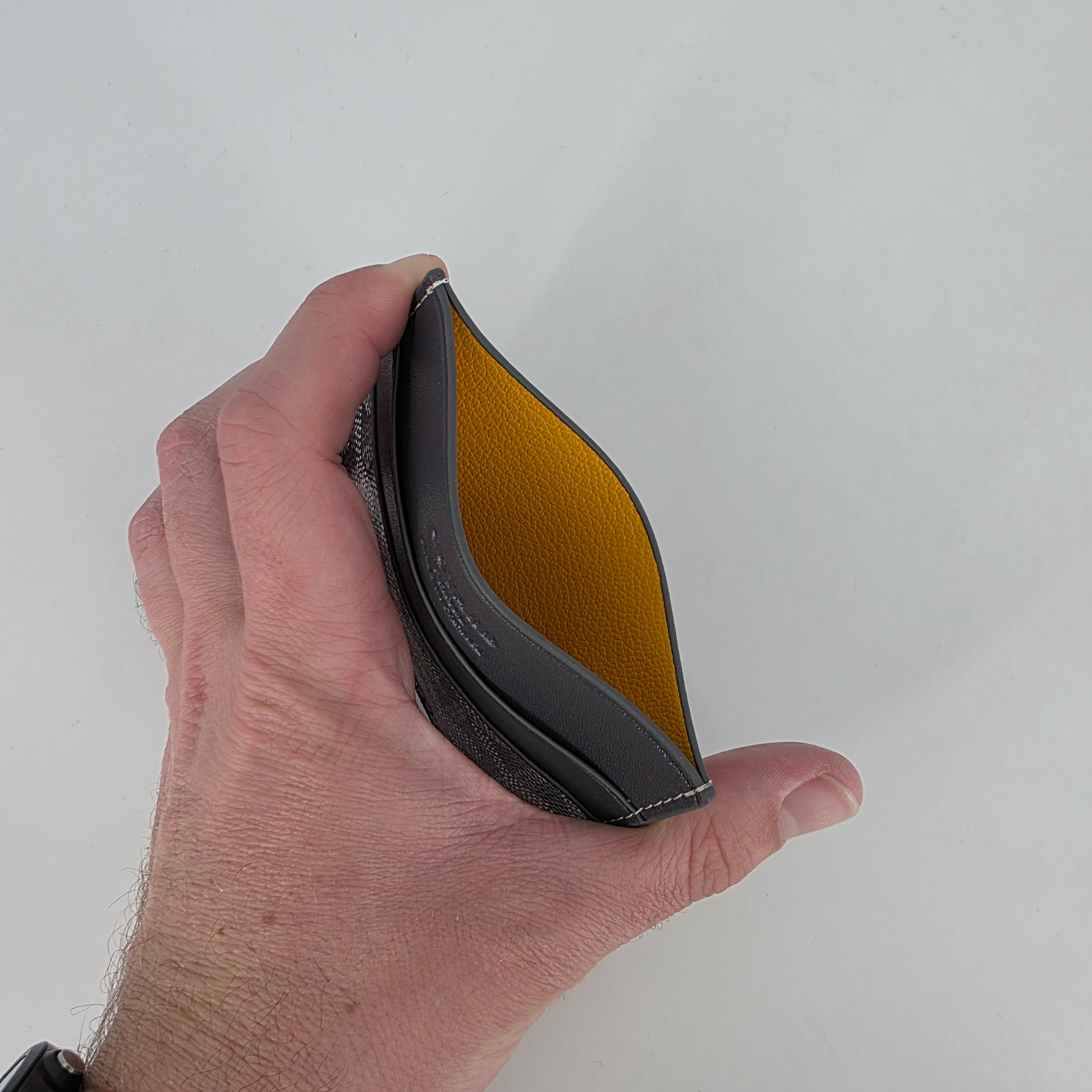 Features: Signature Goyardine canvas, leather trim, multiple card slots, slim profile
